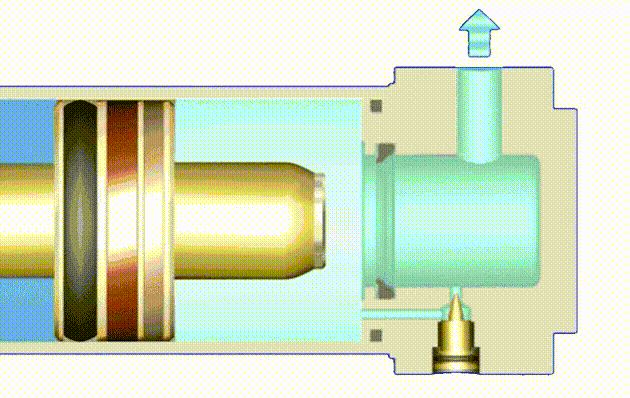 緩沖腔内的氣體隻能通過緩沖閥排出。當緩沖閥的開度很小時,腔内壓力快速上升,該壓力對于活塞産生反作用力,從而使活塞減速,直至停止。